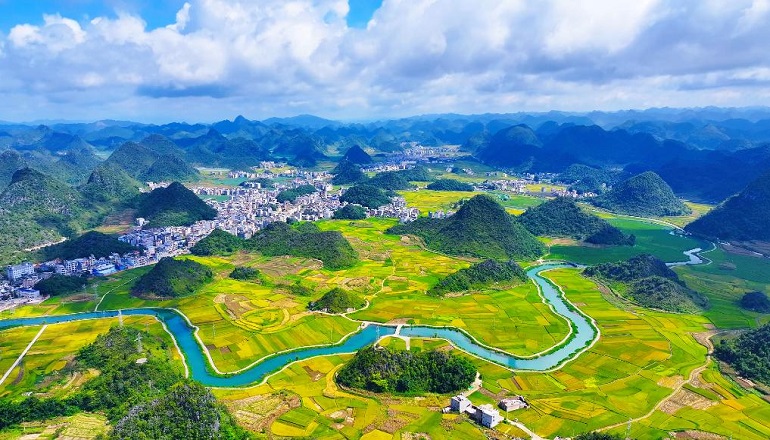 - ယူနန်ပြည်နယ် တာ့ကွမ်းခရိုင်တွင် အလင်းတည့်တည့် စီးဆင်း၍ ရှုခင်းသာယာလှပ