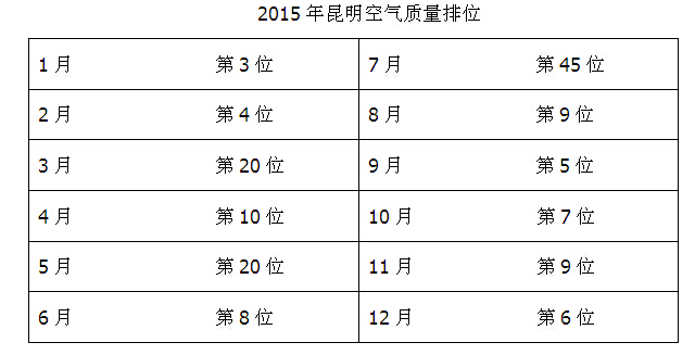 ကူမင္းၿမိဳ႕၏ အေထြေထြ ေလအရည္အေသြးက၂၀၁၄ခုႏွစ္ထက္ ပုိေကာင္းသည္၊ ၂၀၁၅ခုႏွစ္တြင္ (၉)လရွိ၍ အေရွ႕ ေနရာ (၁၀) ရွိေၾကာင္း သိရွိသည္။