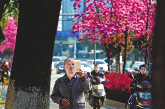 如果有市民住在太平新城,一定知道这里有一条美丽的樱花大道——奥特莱斯大道。无论是到昆华苑、云报记者村或者恒大金碧天下,都要经过这条樱花大道。这条大道上的樱花树不算高,但种得不少,共有3排,绵延数公里长,美轮美奂。