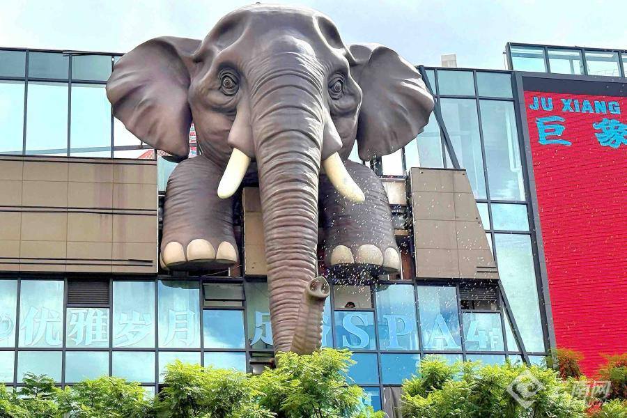 巨型大象以穿墙而出的创意姿态亮相,象征力量、智慧与吉祥,传递美好期许。庞大的象头探出建筑外立面,宽阔的耳朵、修长的象牙与灵动的长鼻极具视觉冲击力。装置配备两大特色互动:大象会定时喷出的七彩泡泡,在阳光下折射出斑斓光影,营造奇幻氛围;整点象鸣则以原始野性的自然声音,为都市生活注入仪式感,让市民在城市中心也能收获自然心灵治愈。