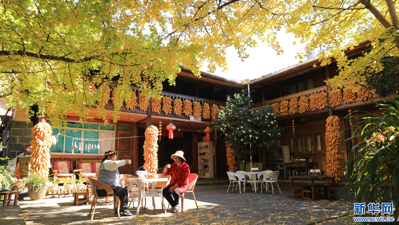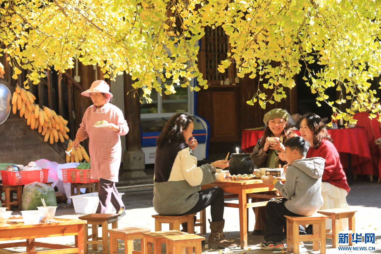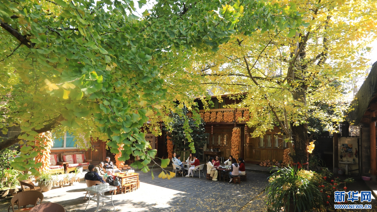 ယူနန်ပြည်နယ် ထိန်ချုံးမြို့ရှိ ဂျင်ဂိုရွာ၏ ဆောင်းရာသီ အငွေ့အသက်များကို ရွှေဝါရောင်ဂျင်ဂိုပင်များအောက်တွင် ထိုင်ရင်း ခံစား
