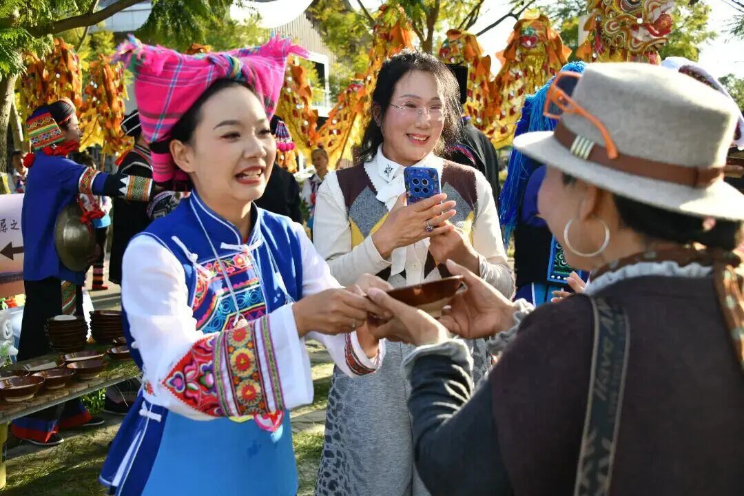 “石屏之约·彝家有宴”,身着民族服饰的工作人员献上迎宾酒。图据石屏县融媒体中心