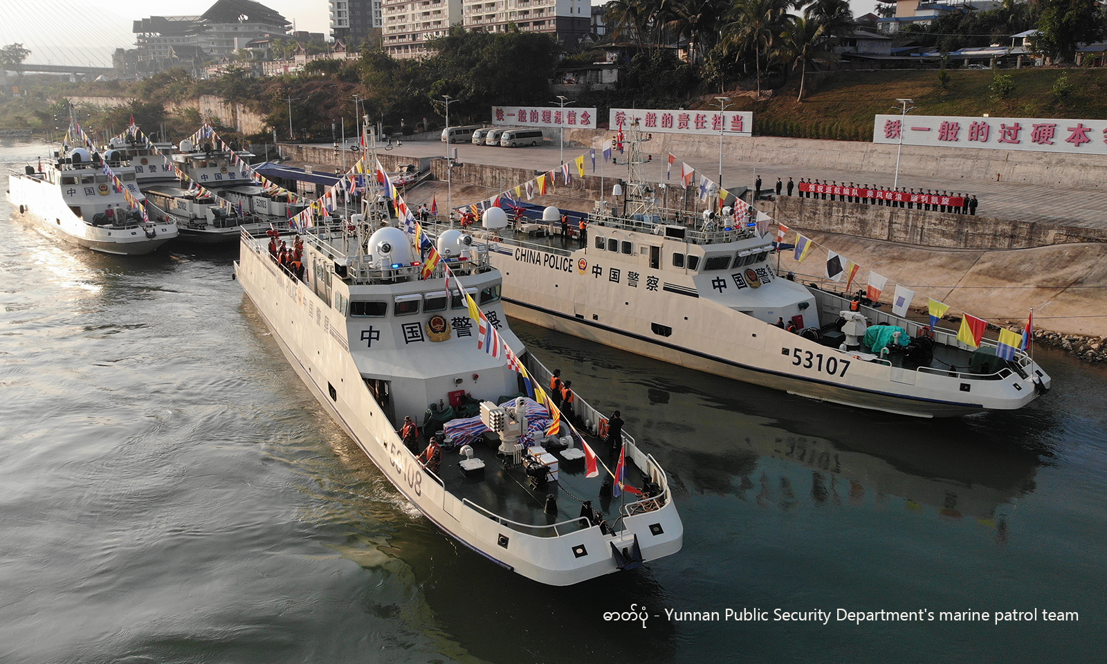 တရုတ်နိုင်ငံ၏ တရားဥပဒေစိုးမိုးရေးရေယာဉ်များ တရုတ်နိုင်ငံ ရှစ်ဆောင်ပဏ္ဏား ကျင်ဟားရဲဘက်ဆိုင်ရာသင်္ဘောဆိပ်မှ ထွက်ခွာနေသည်ကို တွေ့ရစဉ် (ဓာတ်ပုံ - Yunnan Public Security Department's marine patrol team)