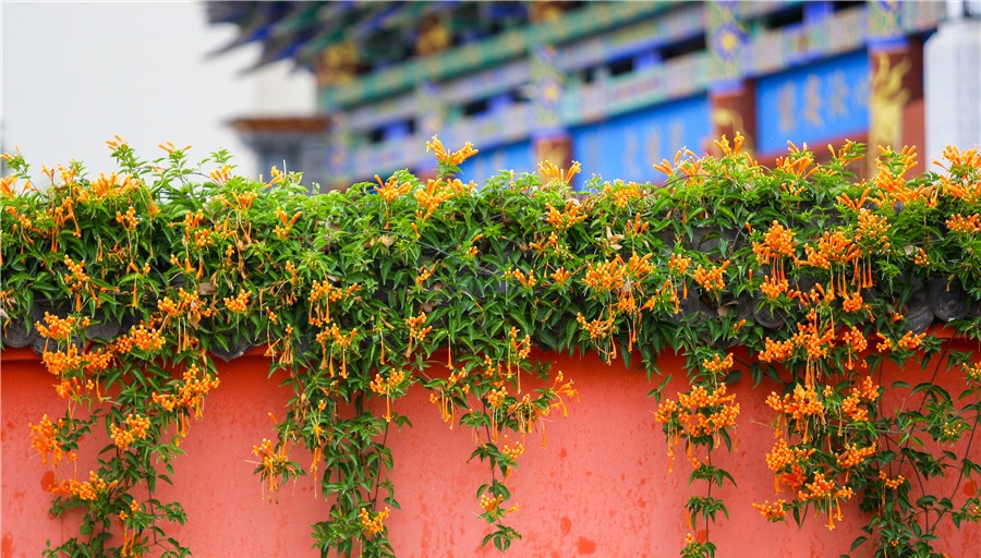 ယူနန္ျပည္နယ္ ခ်ဴက်င့္ၿမိဳ႕၌ Pyrostegia venusta (Ker-Gawl.) Miers ပန္းမ်ားသည္ ပြင့္ဖူးေန၍ နံရံနီႏွင့္ အျပန္အလွန္ တန္းဆာဆင္