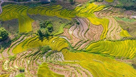 ယူနန်ပြည်နယ် ကွန်နန်ခရိုင်၌ ဆောင်းကူးရာသီရှုခင်းများ ဆေးဆိုးထားသော စပါးစိုက်ခင်းများသည် သီးထွက်များသောနှစ်၏ ရုပ်ပုံကို ရေးဆွဲဖော်ပြ