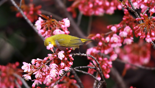 ယူနန်ပြည်နယ် ချိုးပေခရိုင်၌ ငှက်များသည် ပန်းများအကြား ဖြတ်သန်းသွားလာနေကြ၍ ကဗျာကဲ့သို့ လှပ