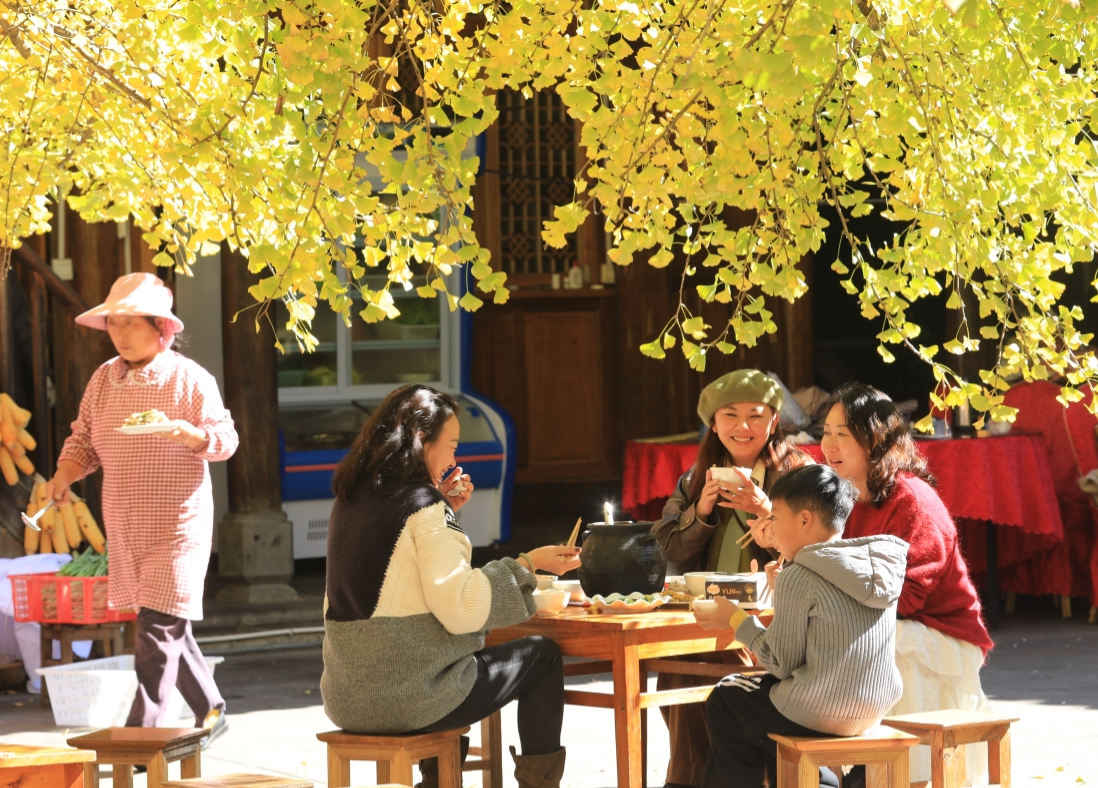 ယူနန် ထိန်ချုံးမြို့ရှိ ဂျင်ဂိုရွာ၏ ဆောင်းရာသီ အငွေ့အသက်ကို ရွှေဝါရောင်ဂျင်ဂိုပင်အောက်တွင် ထိုင်ရင်း ခံစား