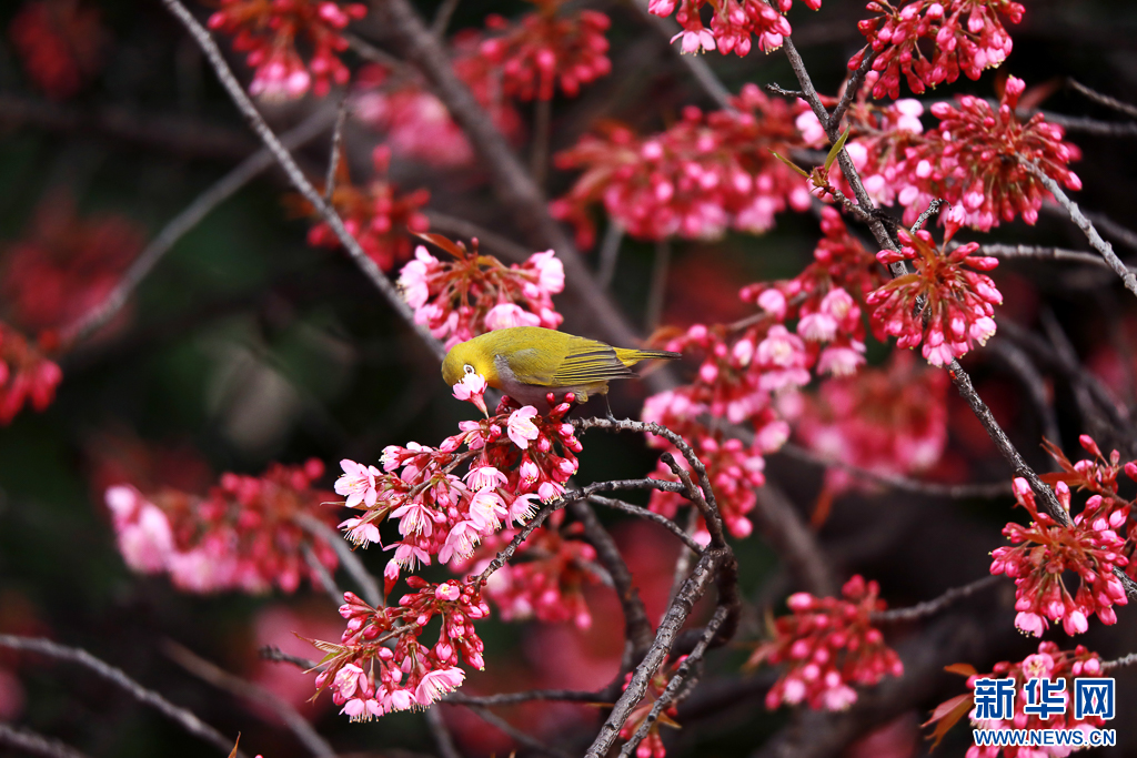 ယူနန်ပြည်နယ် ချိုးပေခရိုင်၌ ငှက်များသည် ပန်းများအကြား ဖြတ်သန်းသွားလာနေကြ၍ ကဗျာကဲ့သို့ လှပ