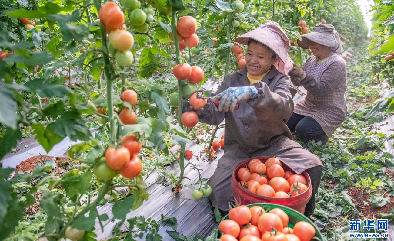 ယူနန်ပြည်နယ် ယန့်စန်းခရိုင်ရှိ ဖန်လုံအိမ်၌ စိုက်ပျိုးထားသော ခရမ်းချဉ်သီးများသည် ကြွယ်ဝချမ်းသာသောဘဝကို ယူဆောင်လာ